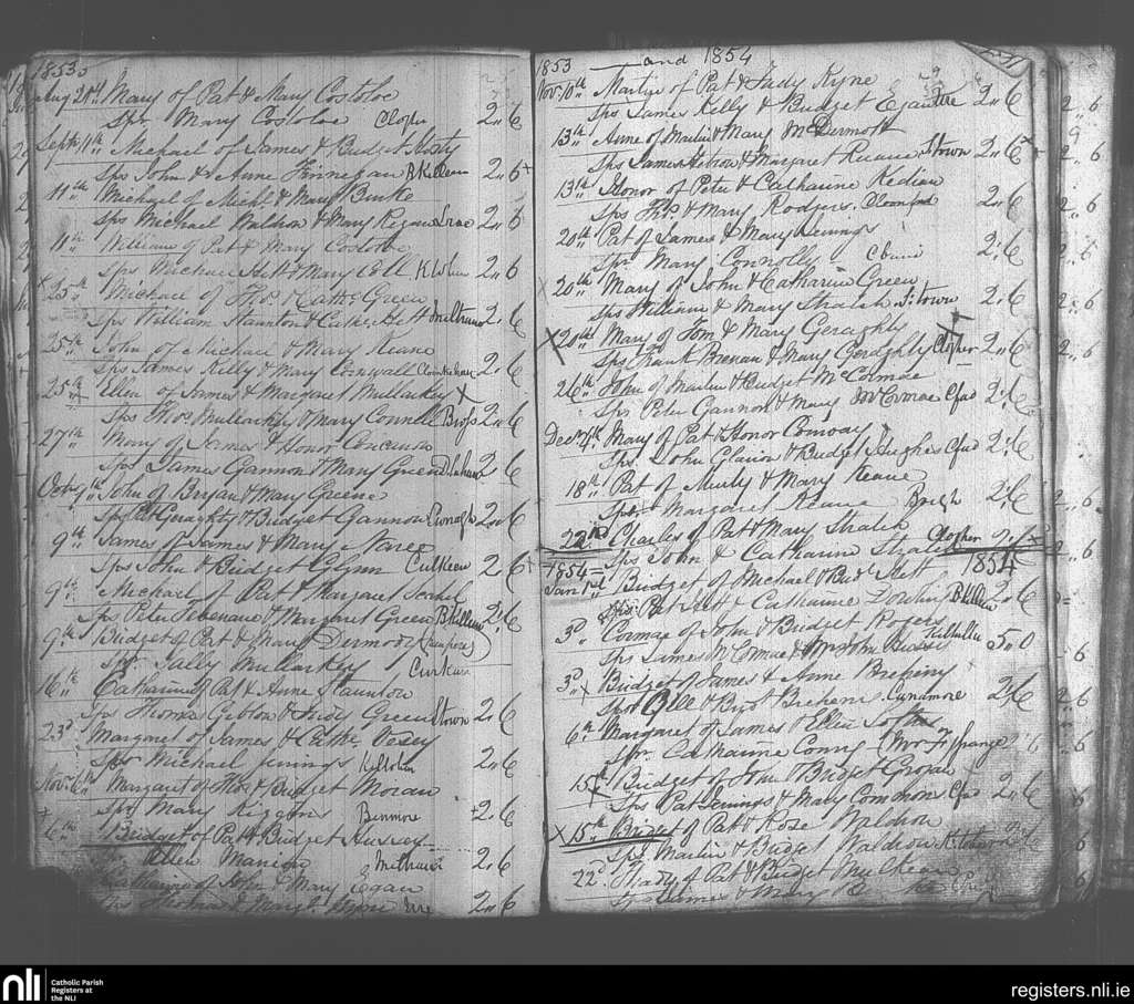 Kiltulla; County of Roscommon; Archdiocese of Tuam. Baptisms, Aug. 1853 to Jan. 1854
