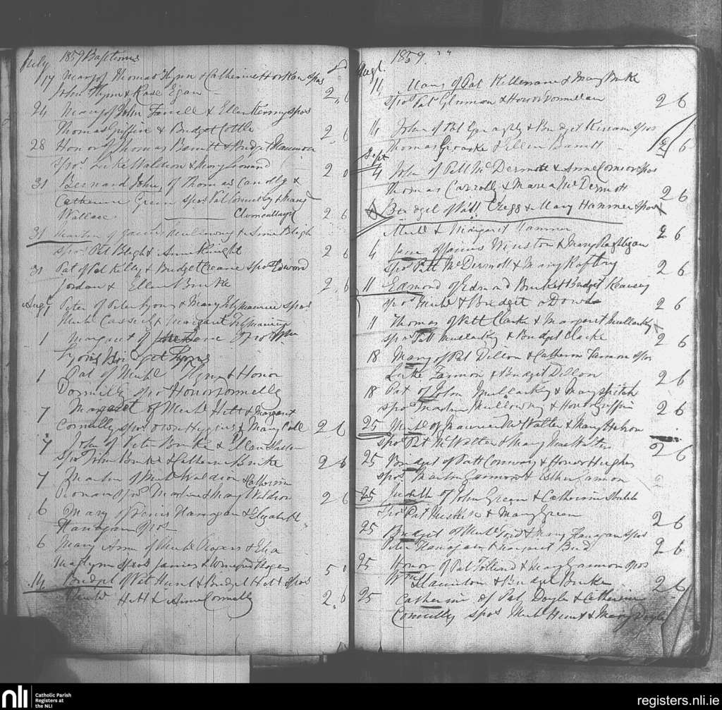 Kiltulla; County of Roscommon; Archdiocese of Tuam. Baptisms, July 1859 to Sep. 1859