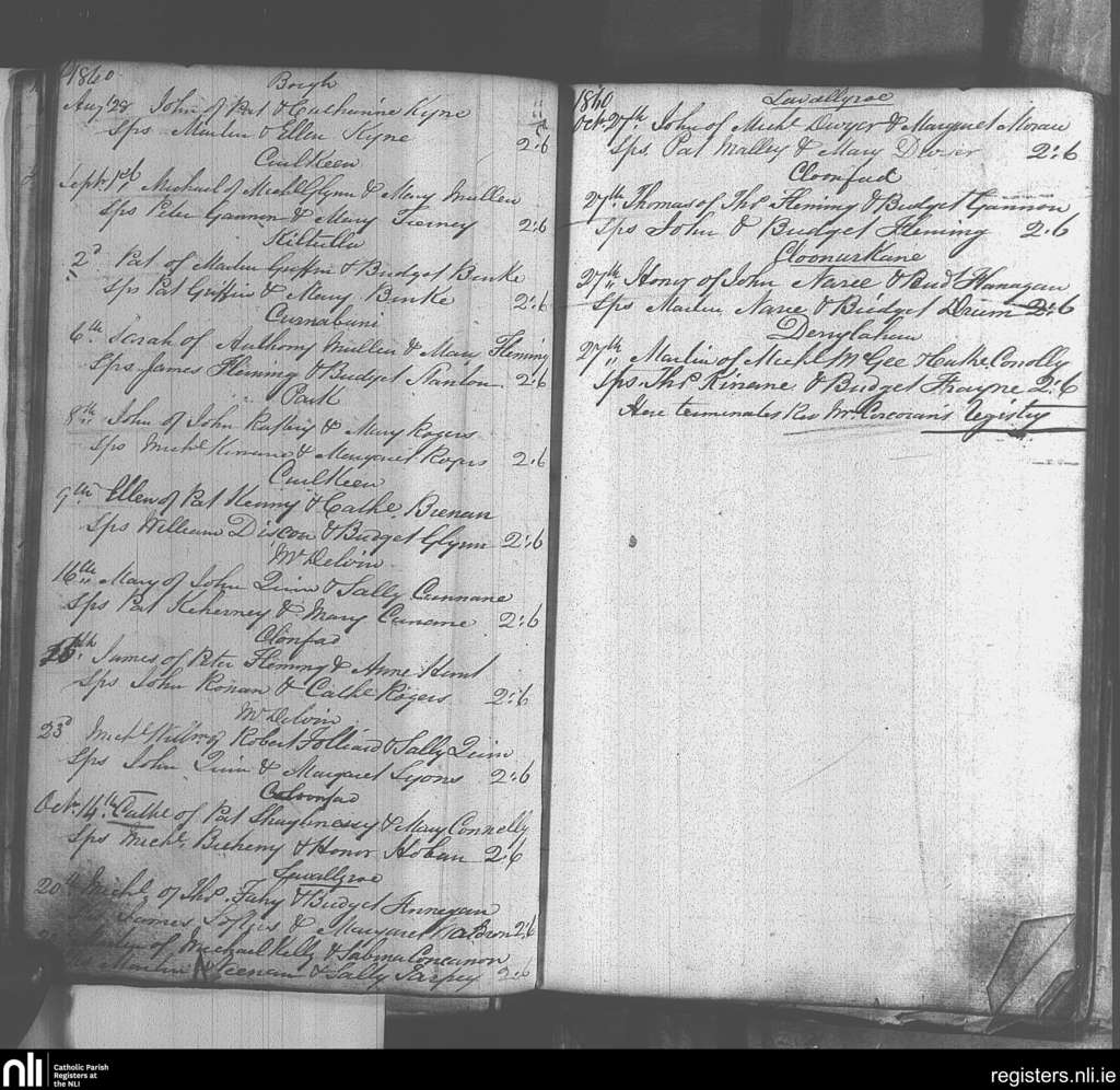 Kiltulla; County of Roscommon; Archdiocese of Tuam. Baptisms, Aug. 1860 to Oct. 1860