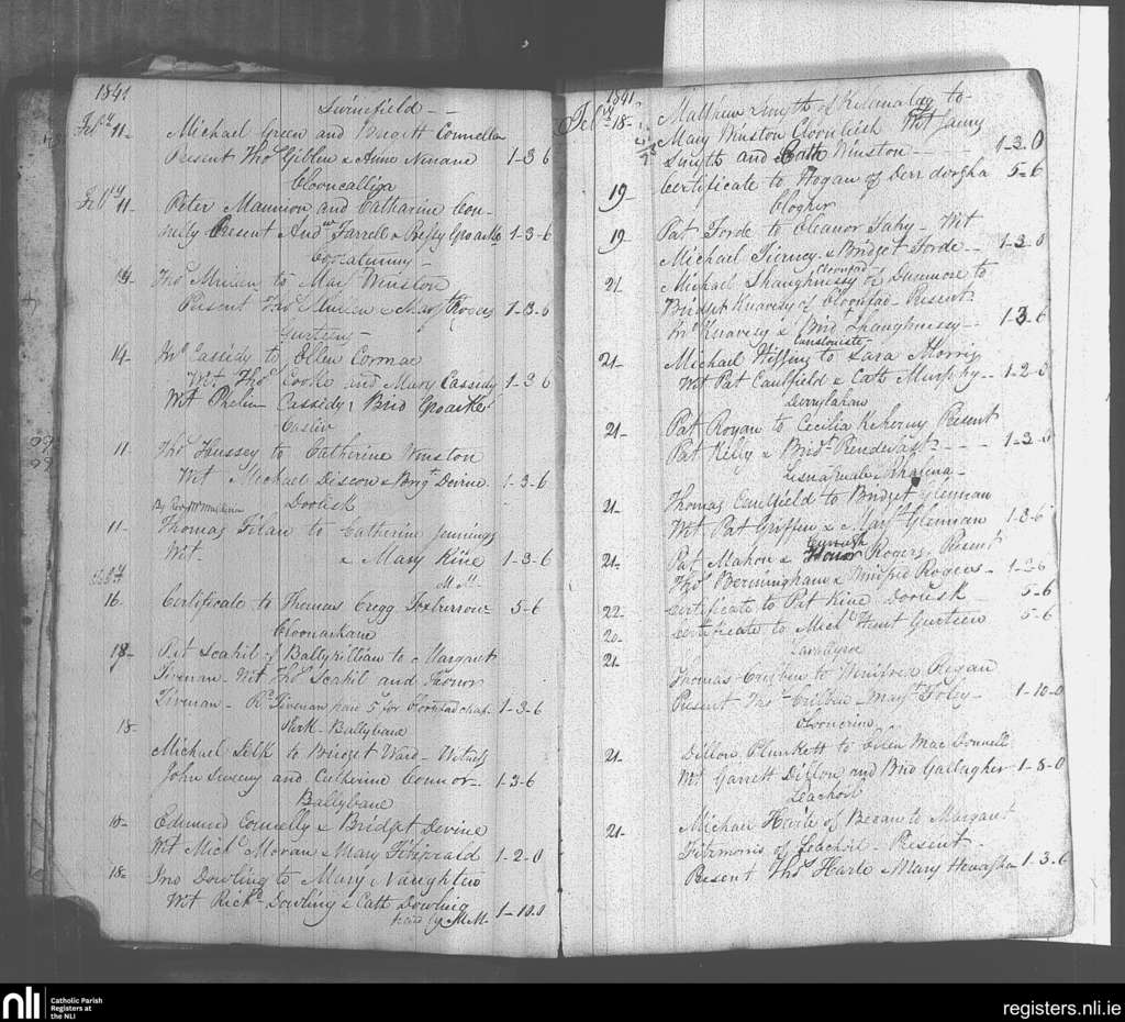 Kiltulla; County of Roscommon; Archdiocese of Tuam. Marriages, Feb. 1841