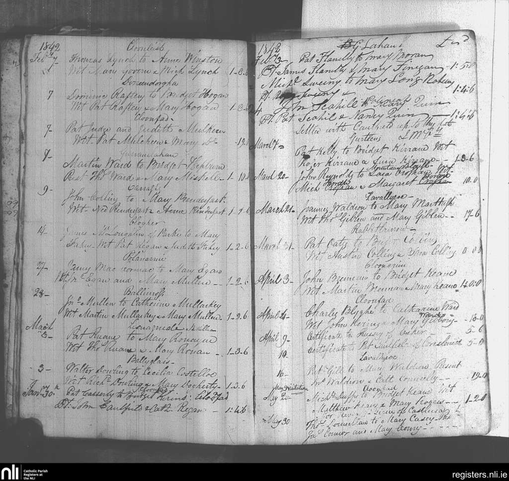 Kiltulla; County of Roscommon; Archdiocese of Tuam. Marriages, Jan. 1842 to May 1842