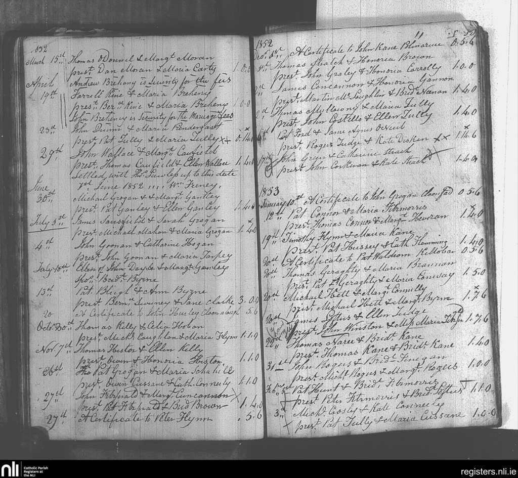 Kiltulla; County of Roscommon; Archdiocese of Tuam. Marriages, Mar. 1852 to Feb. 1853