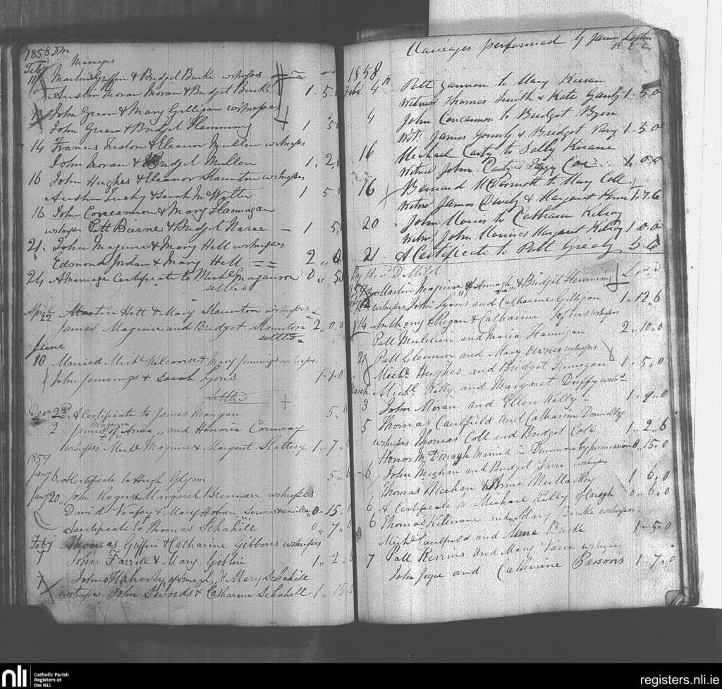 Kiltulla; County of Roscommon; Archdiocese of Tuam. Marriages, Feb. 1858 to Mar. 1859