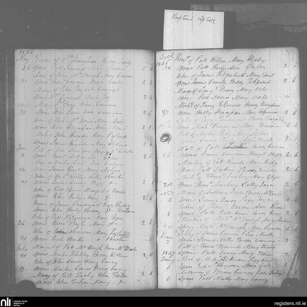 Mayo Abbey; County of Mayo; Archdiocese of Tuam. Baptisms, May 1856 to Jan. 1857