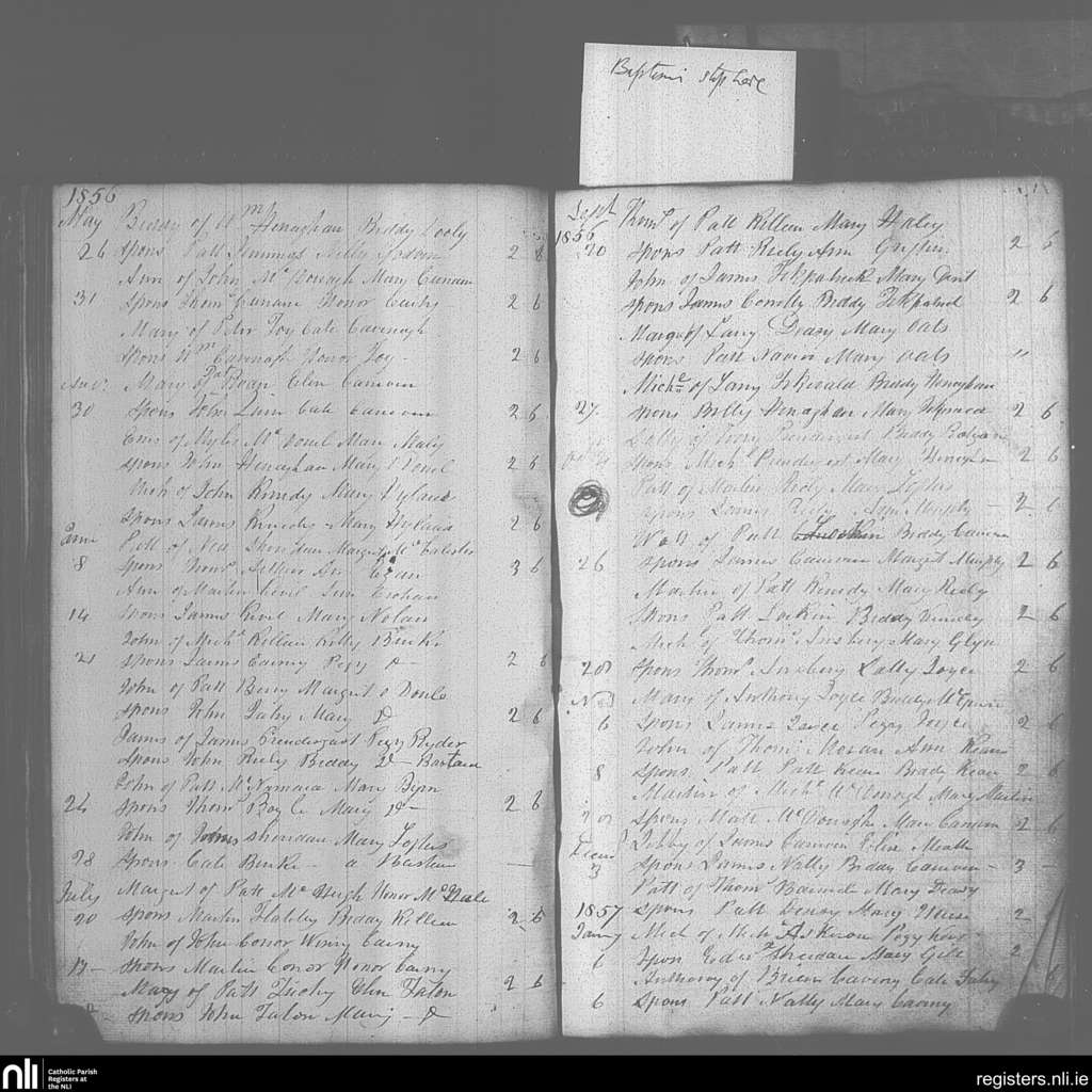 Mayo Abbey; County of Mayo; Archdiocese of Tuam. Baptisms, May 1856 to Jan. 1857
