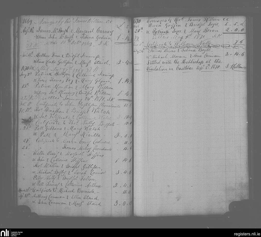 Mayo Abbey; County of Mayo; Archdiocese of Tuam. Marriages, Aug. 1869 to July 1870