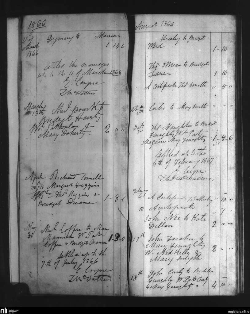 Moylough; County of Galway; Archdiocese of Tuam. Marriages, Mar. 1866 to Feb. 1867