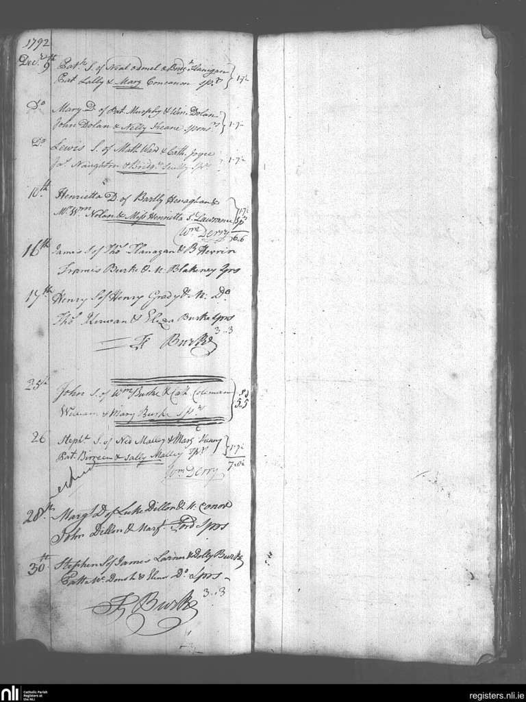Tuam; County of Galway; Archdiocese of Tuam. Baptisms, Dec. 1792