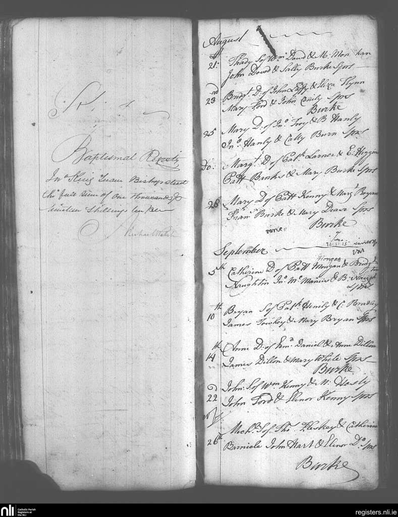 Tuam; County of Galway; Archdiocese of Tuam. Baptisms, Aug. 1794 to Sep. 1794