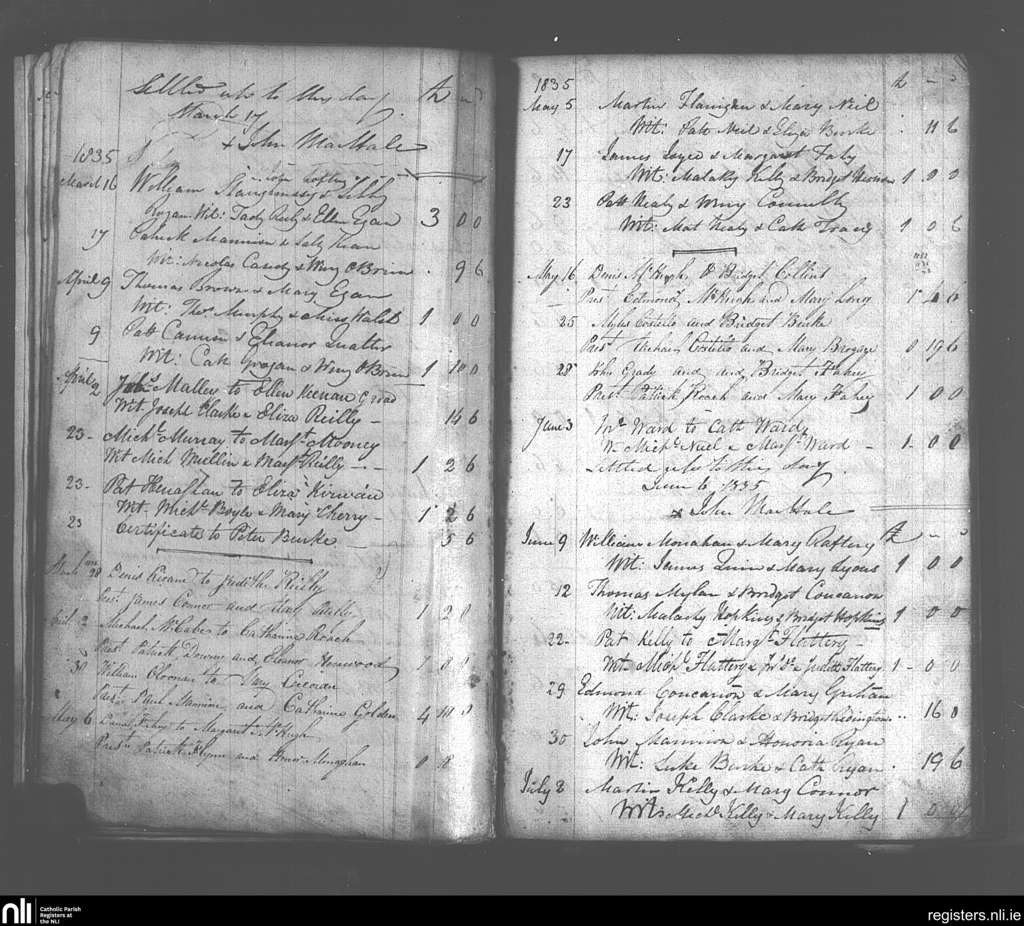 Tuam; County of Galway; Archdiocese of Tuam. Marriages, Mar. 1835 to July 1835