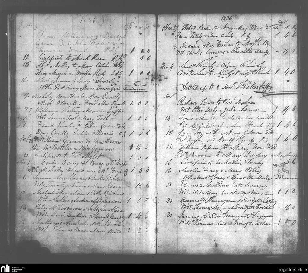 Tuam; County of Galway; Archdiocese of Tuam. Marriages, Oct. 1836 to Dec. 1836