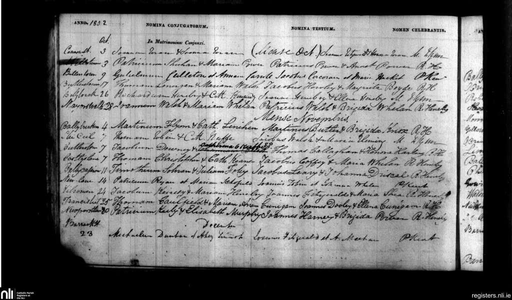 Ballybricken, Waterford city; County of Waterford; Diocese of Waterford and Lismore. Marriages, Oct. 1852 to Dec. 1852