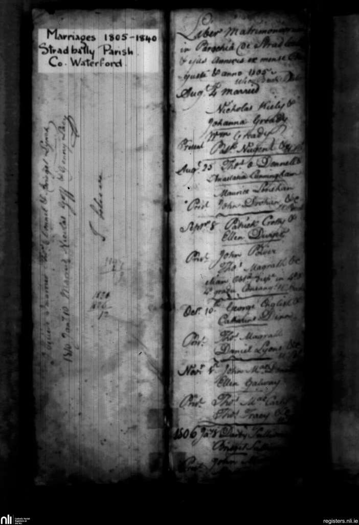 Stradbally; County of Waterford; Diocese of Waterford and Lismore. Marriages, Aug. 1805 to Jan. 1806