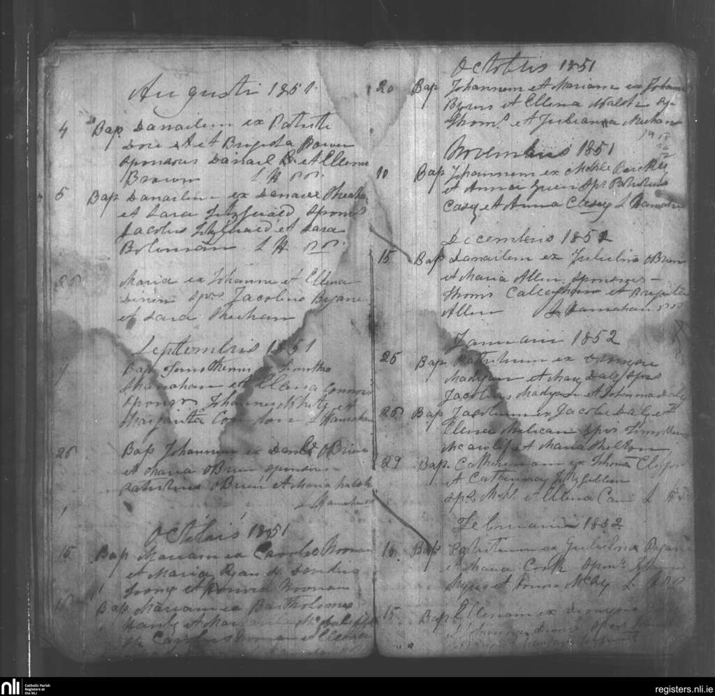 Ballyagran; County of Cork, Limerick; Diocese of Limerick. Baptisms, Aug. 1851 to Feb. 1852