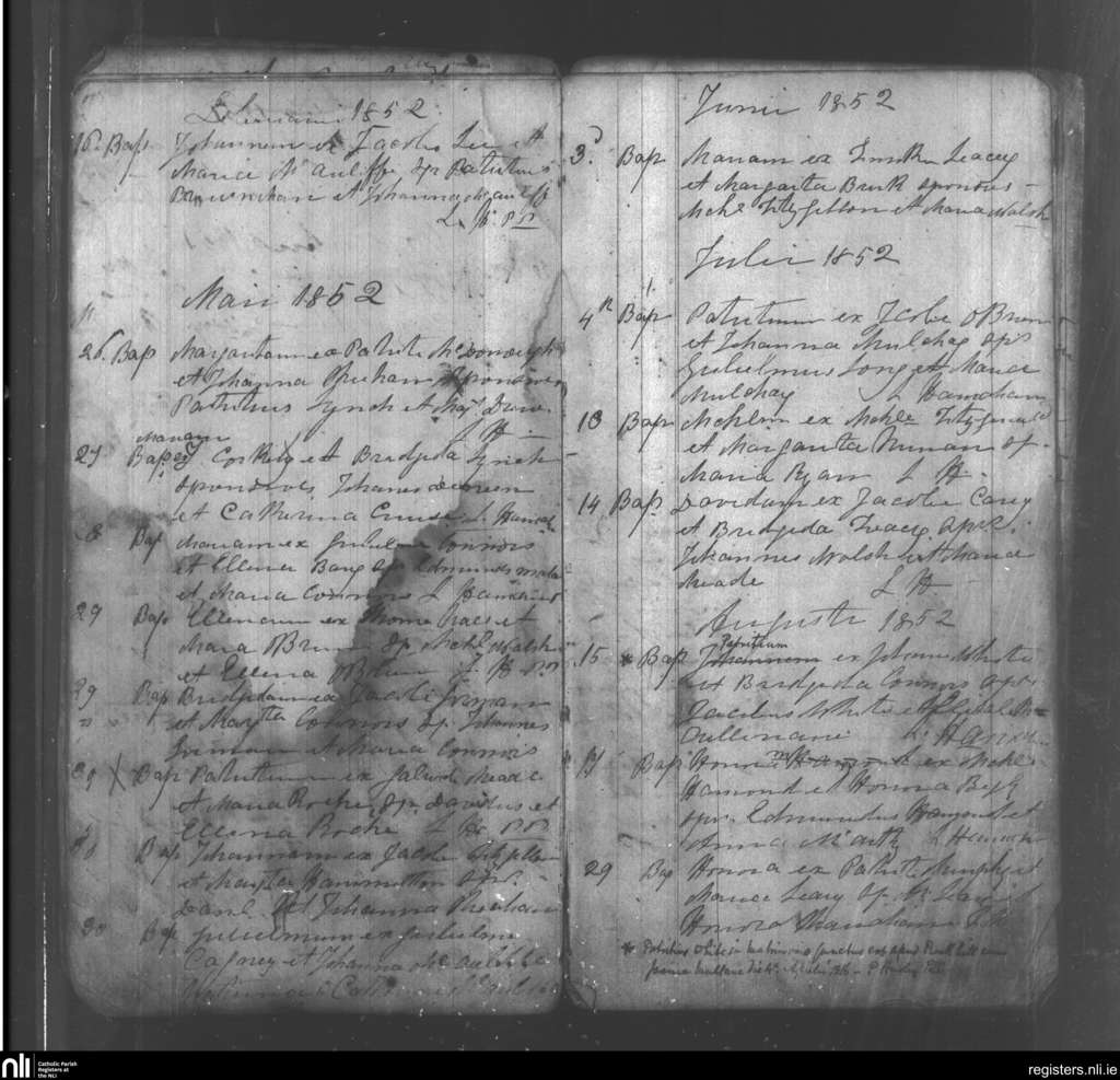 Ballyagran; County of Cork, Limerick; Diocese of Limerick. Baptisms, Feb. 1852 to Aug. 1852