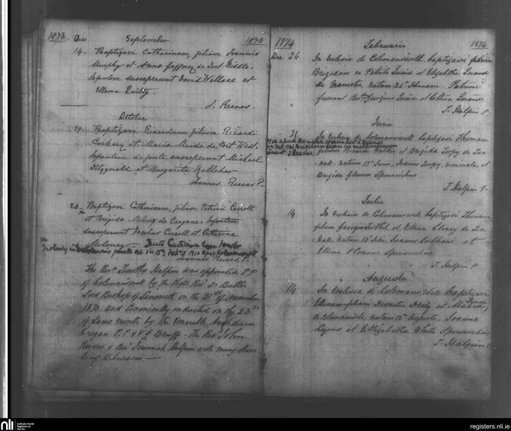 Ballyagran; County of Limerick, Cork; Diocese of Limerick. Baptisms, Sep. 1873 to Aug. 1874