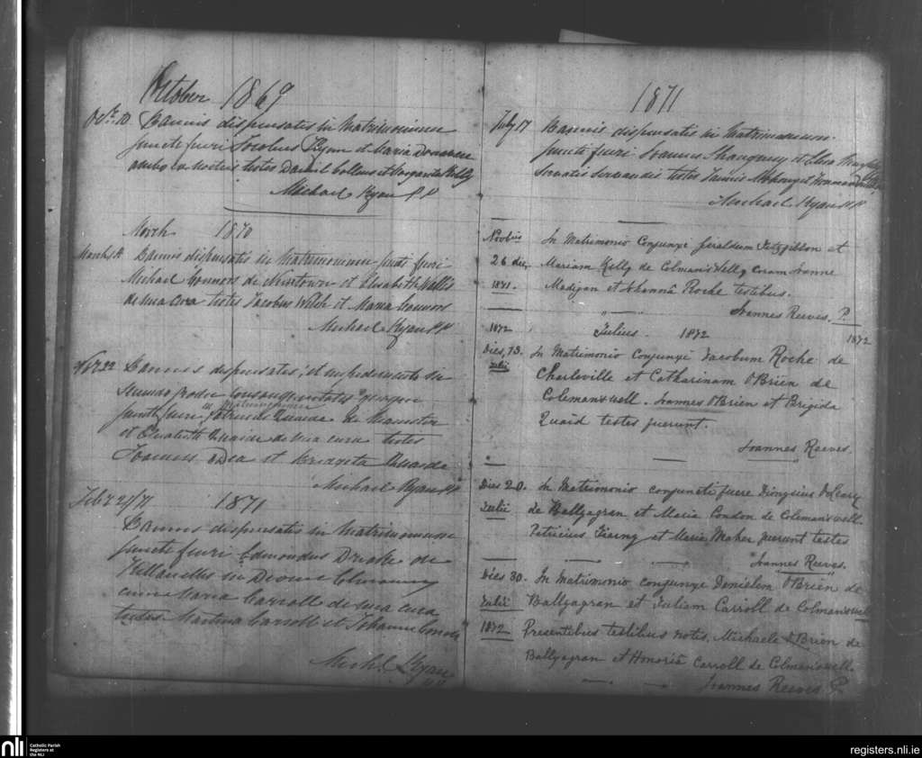 Ballyagran; County of Limerick, Cork; Diocese of Limerick. Marriages, Oct. 1869 to July 1872