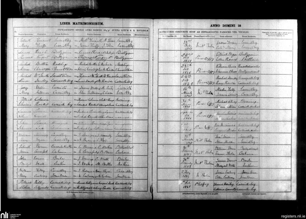 Carrickbeg; County of Waterford; Diocese of Waterford and Lismore. Marriages, Feb. 1868 to Feb. 1869