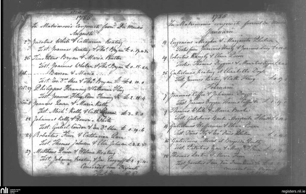 Killea; County of Waterford; Diocese of Waterford and Lismore. Marriages, Aug. 1785 to Feb. 1786
