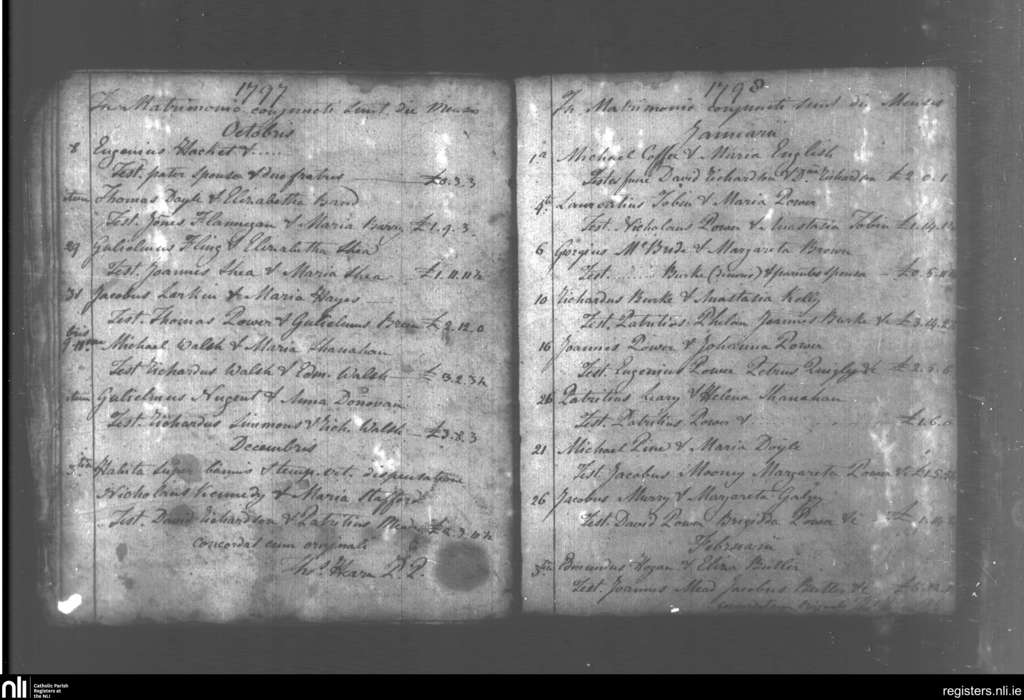 Killea; County of Waterford; Diocese of Waterford and Lismore. Marriages, Oct. 1797 to Feb. 1798