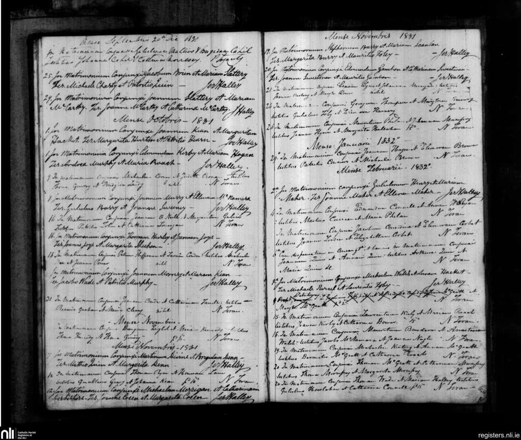 Dungarvan; County of Waterford; Diocese of Waterford and Lismore. Marriages, Sep. 1831 to Feb. 1832