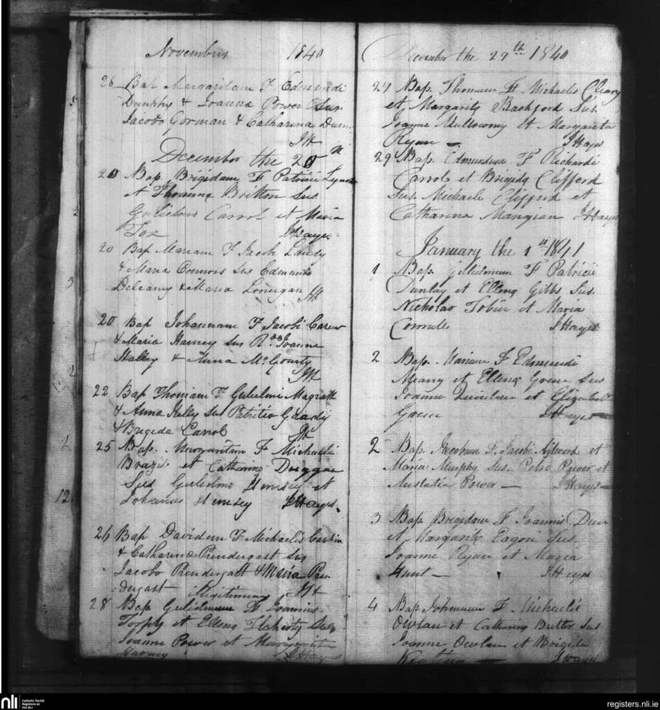 Gambonsfield and Kilcash; County of Tipperary, Waterford; Diocese of Waterford and Lismore. Baptisms, Nov. 1840 to Jan. 1841