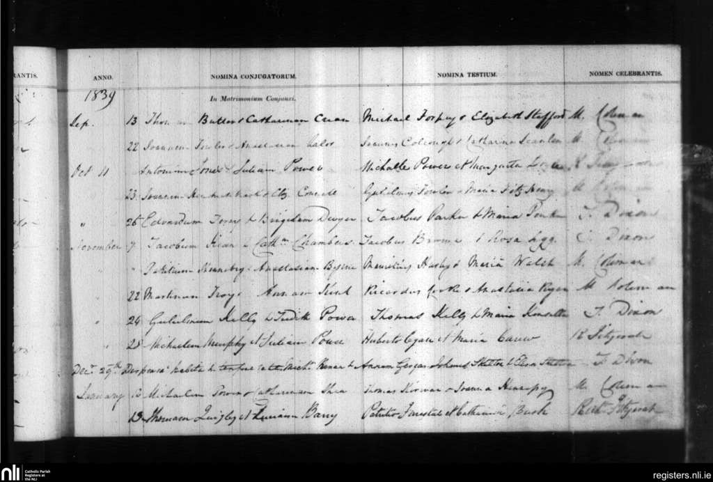 Holy Trinity, Waterford city; County of Waterford; Diocese of Waterford and Lismore. Marriages, Sep. 1839 to Jan. 1840