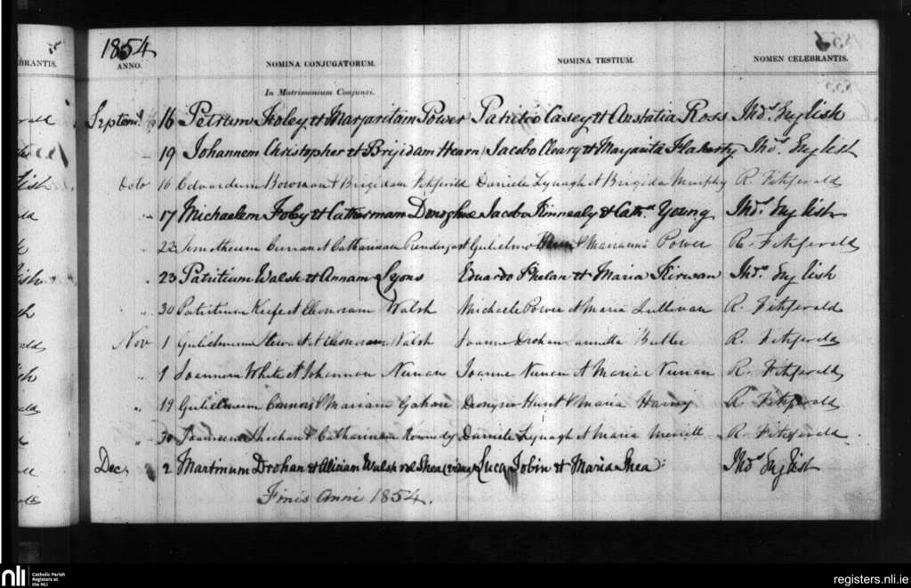 Holy Trinity, Waterford city; County of Waterford; Diocese of Waterford and Lismore. Marriages, Sep. 1854 to Dec. 1854