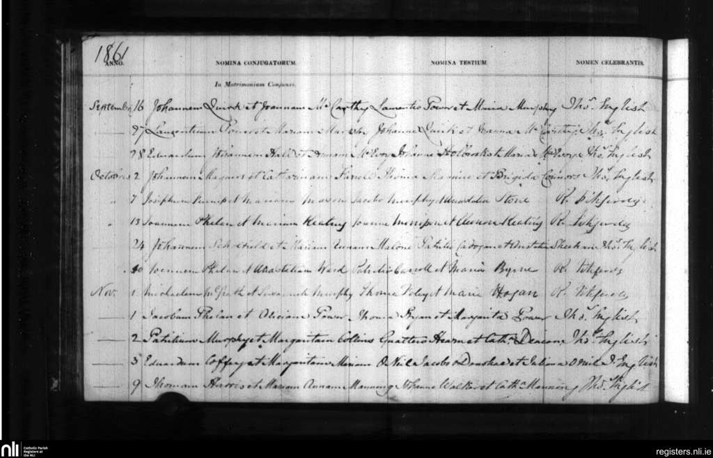 Holy Trinity, Waterford city; County of Waterford; Diocese of Waterford and Lismore. Marriages, Sep. 1861 to Nov. 1861