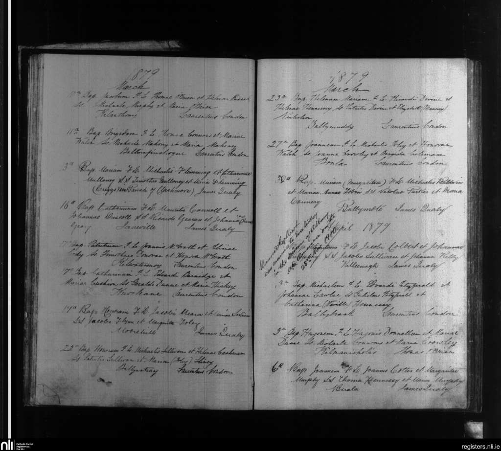 Knockanore; County of Waterford; Diocese of Waterford and Lismore. Baptisms, Mar. 1879 to Apr. 1879
