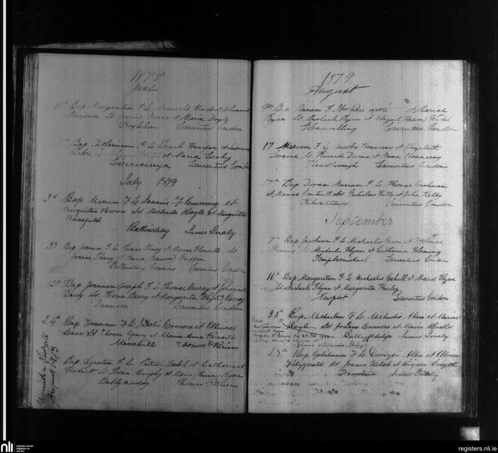 Knockanore; County of Waterford; Diocese of Waterford and Lismore. Baptisms, June 1879 to Sep. 1879