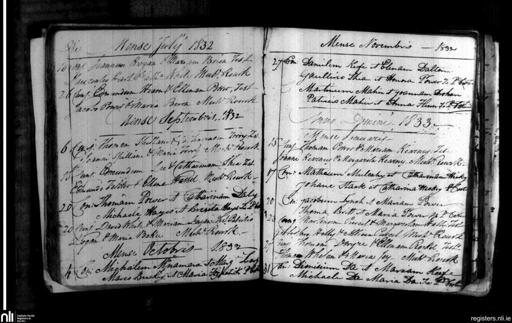 Portlaw; County of Waterford; Diocese of Waterford and Lismore. Marriages, July 1832 to Jan. 1833