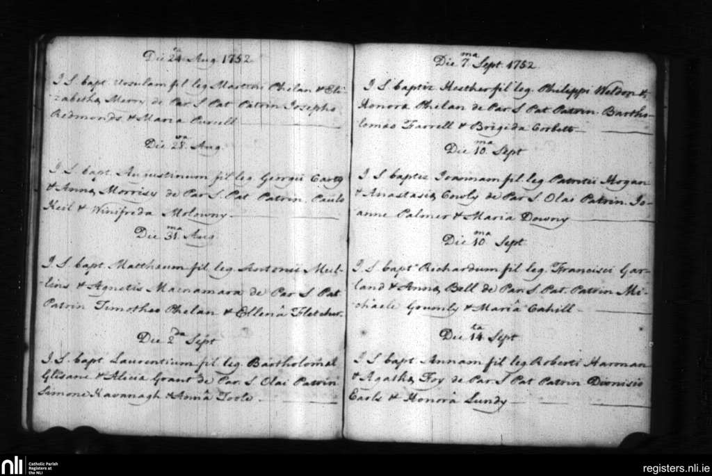 St. Patrick's and St. Olaf's, Waterford city; County of Waterford; Diocese of Waterford and Lismore. Baptisms, Aug. 1752 to Sep. 1752