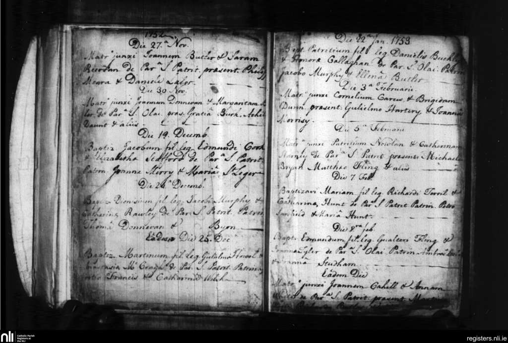 St. Patrick's and St. Olaf's, Waterford city; County of Waterford; Diocese of Waterford and Lismore. Baptisms, Marriages, Nov. 1752 to Feb. 1753