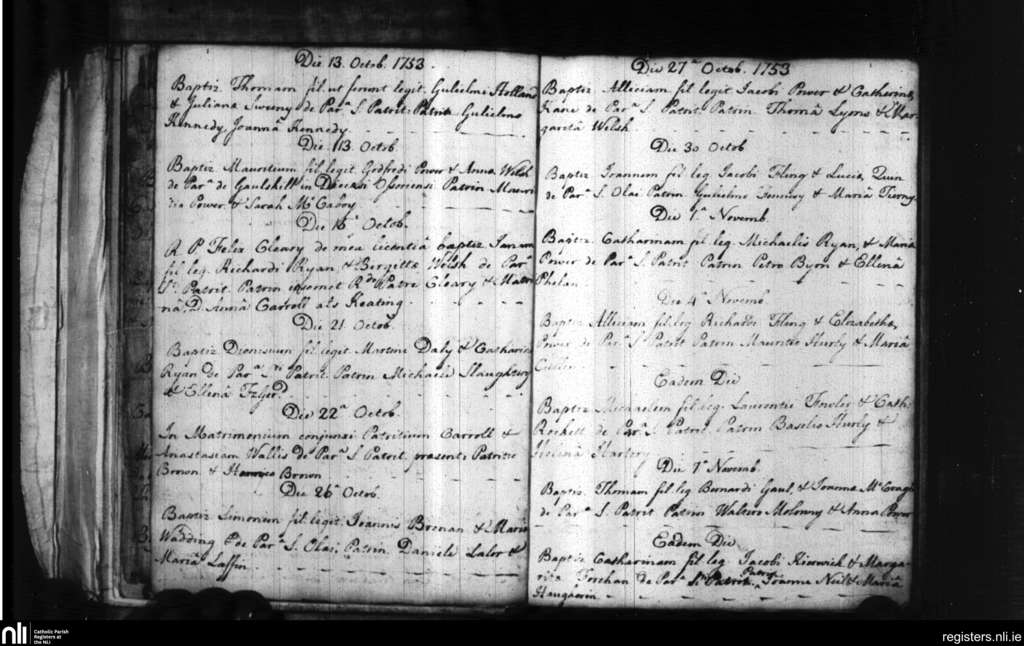 St. Patrick's and St. Olaf's, Waterford city; County of Waterford; Diocese of Waterford and Lismore. Baptisms, Marriages, Oct. 1753 to Nov. 1753