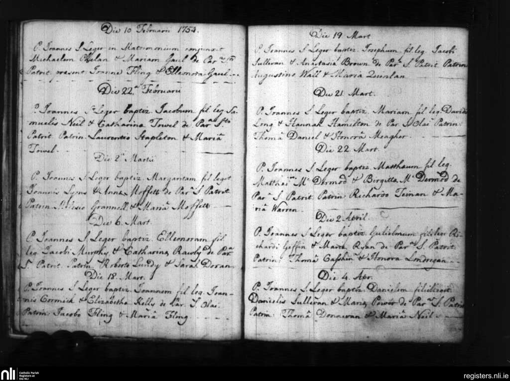 St. Patrick's and St. Olaf's, Waterford city; County of Waterford; Diocese of Waterford and Lismore. Baptisms, Marriages, Feb. 1754 to Apr. 1754