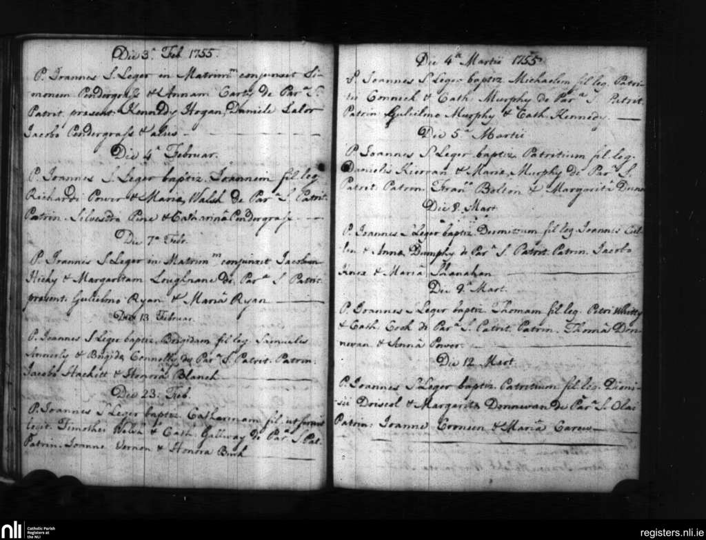 St. Patrick's and St. Olaf's, Waterford city; County of Waterford; Diocese of Waterford and Lismore. Baptisms, Marriages, Feb. 1755 to Mar. 1755