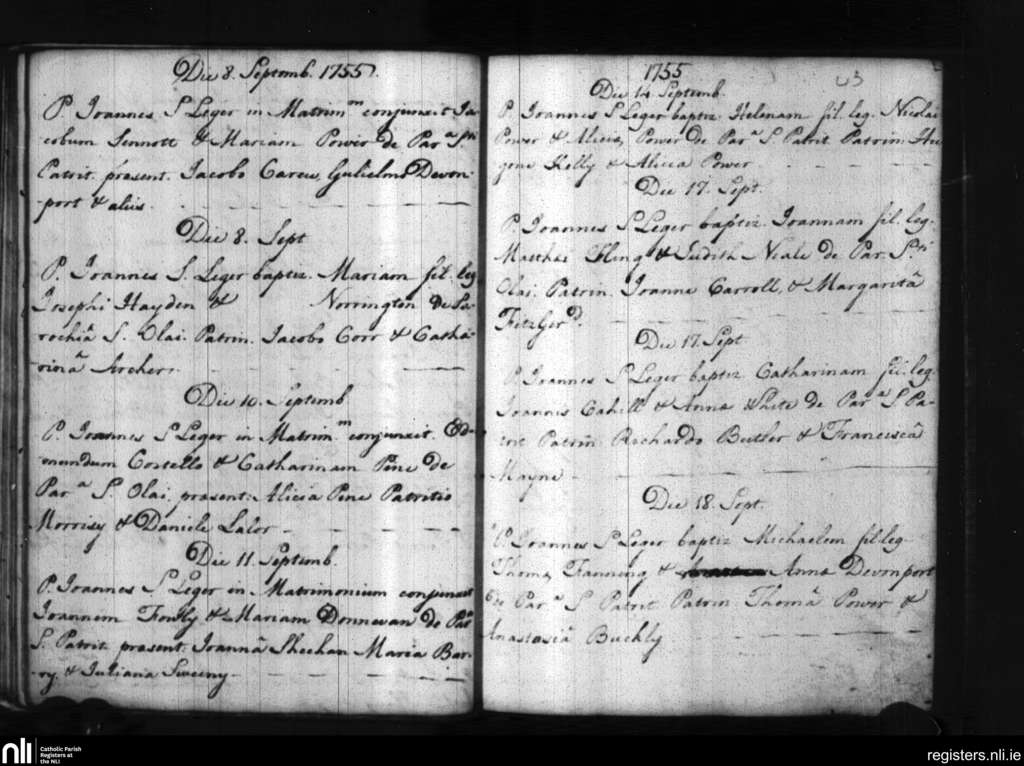St. Patrick's and St. Olaf's, Waterford city; County of Waterford; Diocese of Waterford and Lismore. Baptisms, Marriages, Sep. 1755