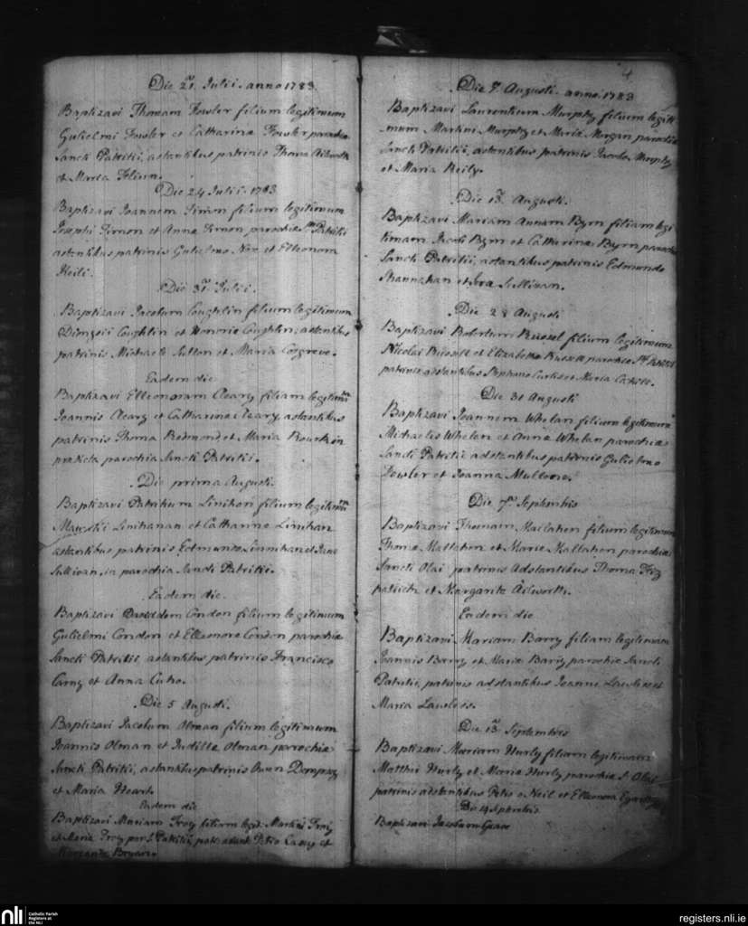 St. Patrick's and St. Olaf's, Waterford city; County of Waterford; Diocese of Waterford and Lismore. Baptisms, July 1783 to Sep. 1783