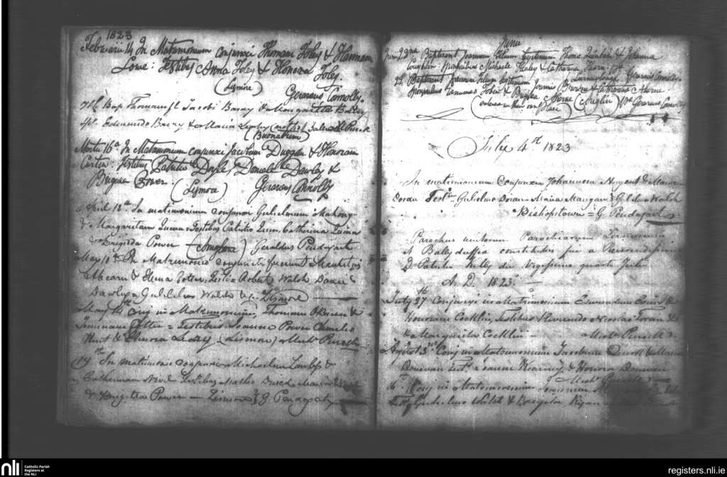 Lismore; County of Cork, Waterford; Diocese of Waterford and Lismore. Marriages, Feb. 1823 to Aug. 1823