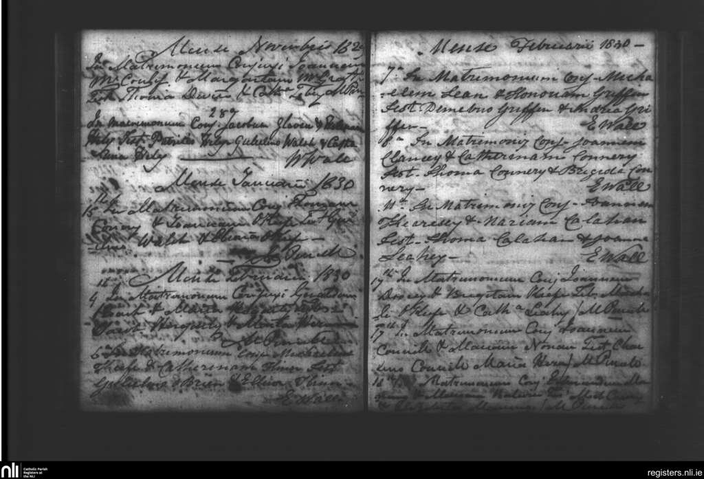 Lismore; County of Cork, Waterford; Diocese of Waterford and Lismore. Marriages, Nov. 1829 to Feb. 1830