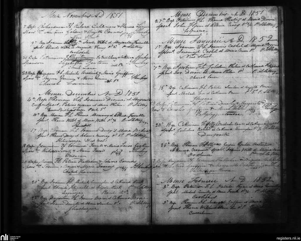 Lismore; County of Waterford, Cork; Diocese of Waterford and Lismore. Baptisms, Nov. 1851 to Feb. 1852