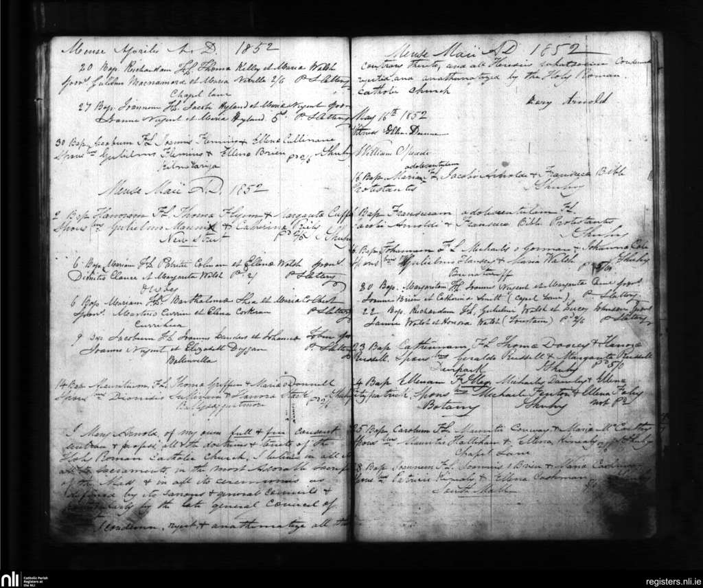Lismore; County of Waterford, Cork; Diocese of Waterford and Lismore. Baptisms, Apr. 1852 to May 1852