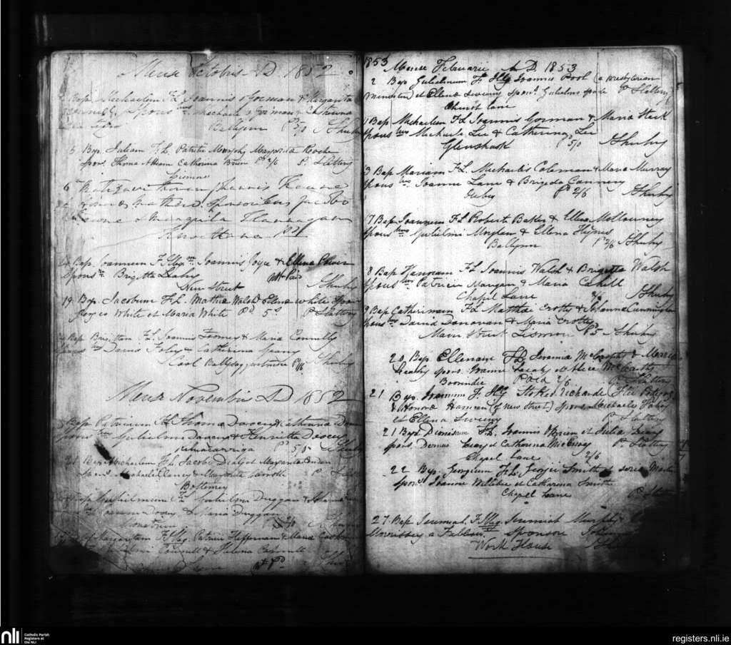 Lismore; County of Waterford, Cork; Diocese of Waterford and Lismore. Baptisms, Oct. 1852 to Feb. 1853