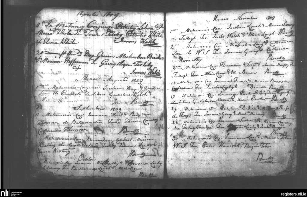 Tallow; County of Waterford; Diocese of Waterford and Lismore. Marriages, Apr. 1809 to Nov. 1809