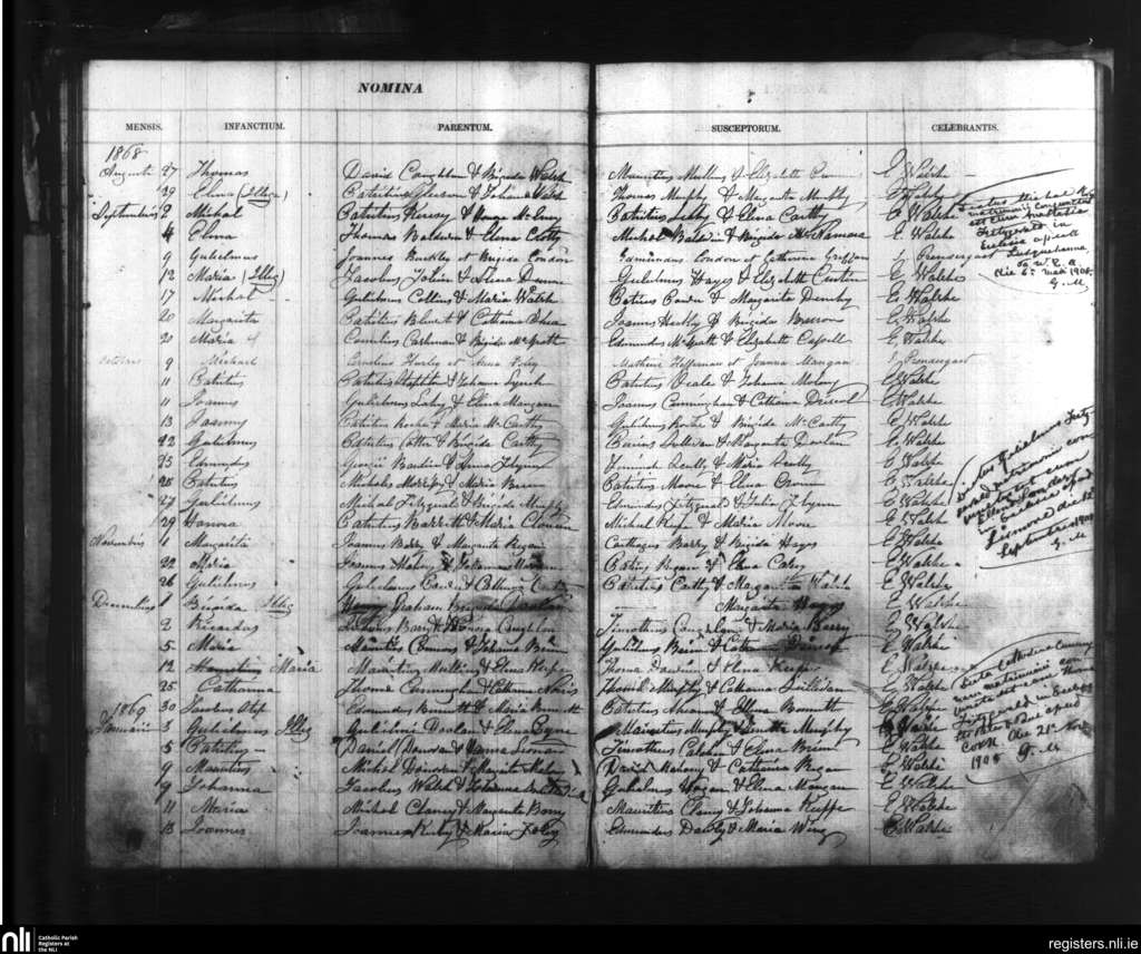 Tallow; County of Waterford; Diocese of Waterford and Lismore. Baptisms, Aug. 1868 to Jan. 1869