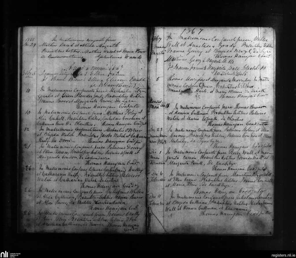 Touraneena; County of Waterford; Diocese of Waterford and Lismore. Marriages, Nov. 1866 to Feb. 1868