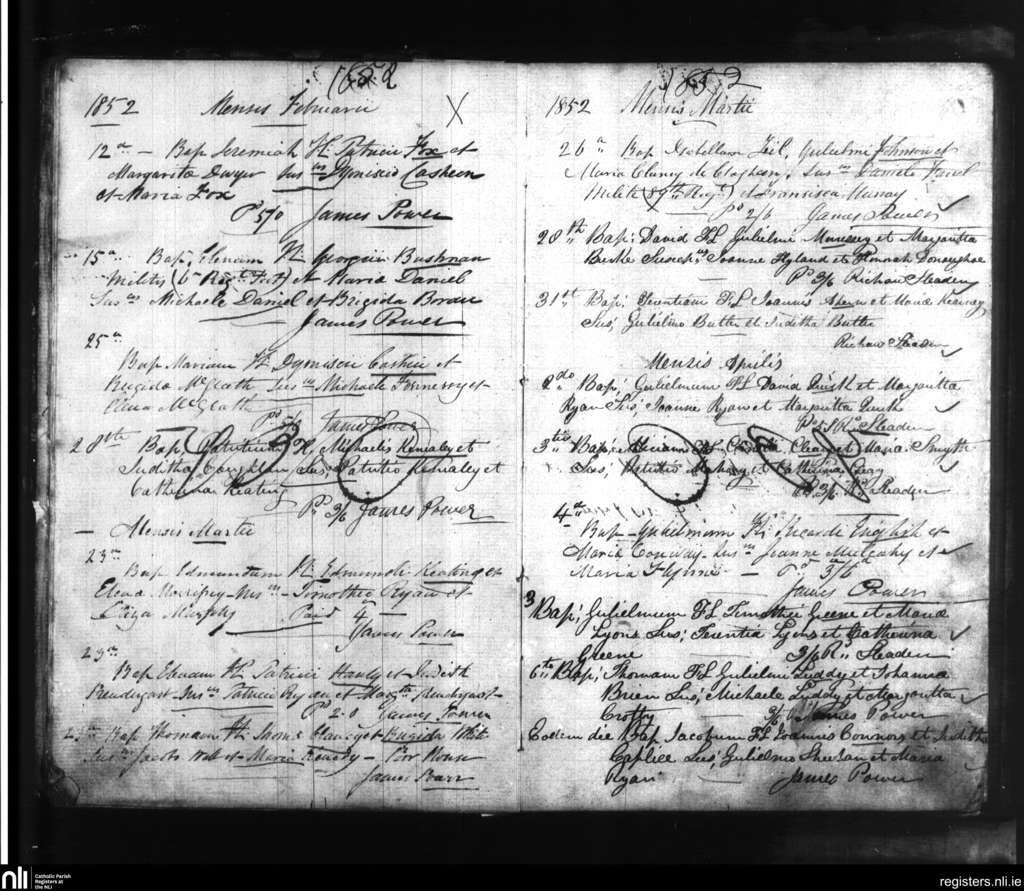 Clogheen; County of Tipperary; Diocese of Waterford and Lismore. Baptisms, Feb. 1852 to Apr. 1852