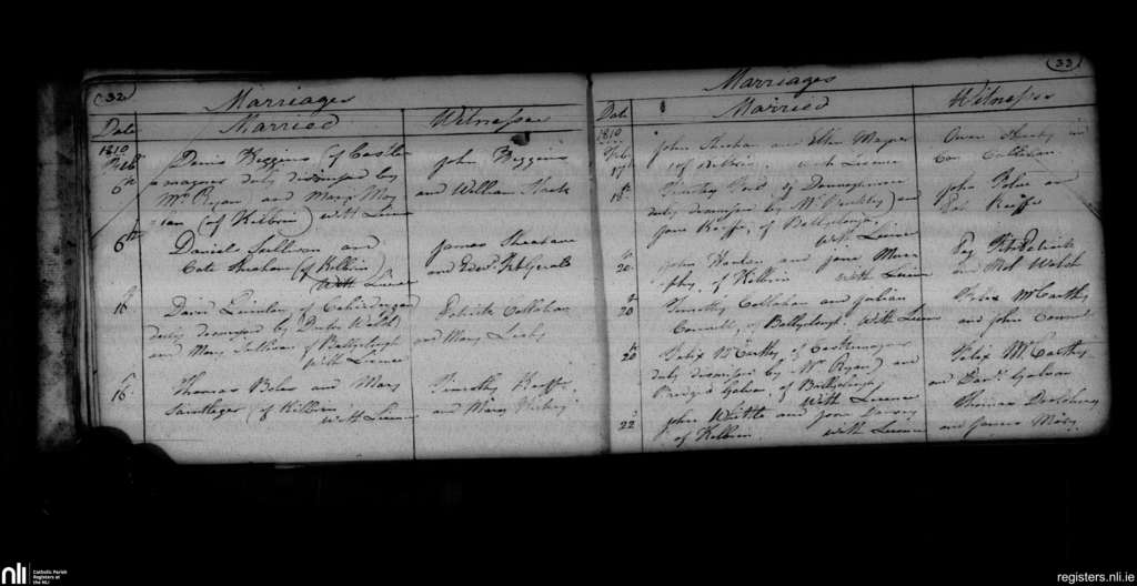 Ballyclough; County of Cork; Diocese of Cloyne. Marriages, Feb. 1810