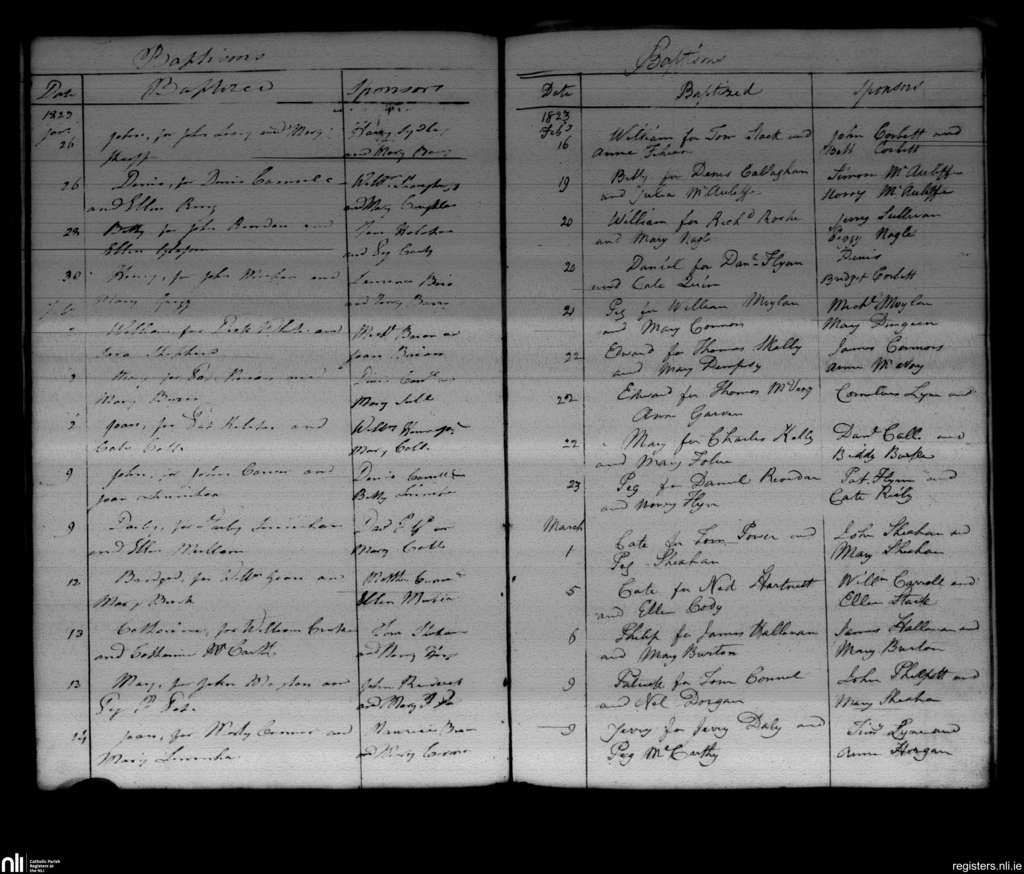 Ballyclough; County of Cork; Diocese of Cloyne. Baptisms, Jan. 1823 to Mar. 1823